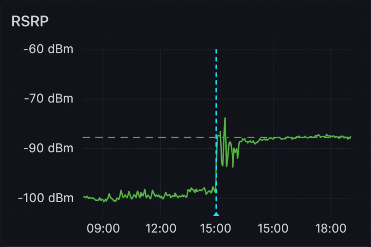 I moved the modem to the upstairs room that’s closest to the T-Mobile antenna a few streets over — and the visual speaks for itself. The signal strength improved by about 15 decibels, a substantial boost that translates to roughly 30X more received signal power.