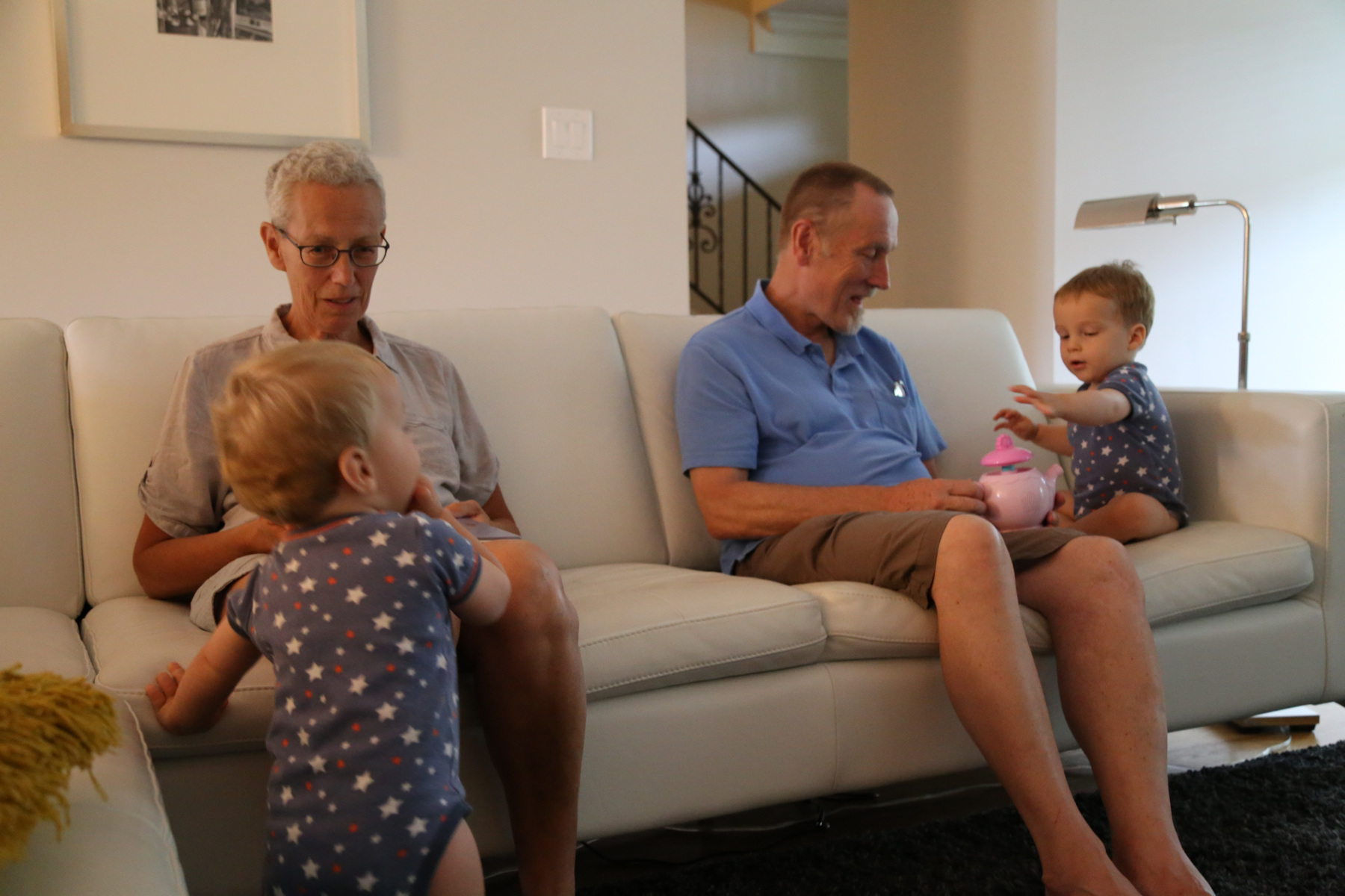 My parents and the boys are having a really nice time together. There is always something to two with two little babies, but sometimes they are just hanging out together and they play. Leo keeps bringing new books to Oma to read, and Adrian was repeatedly looking at the same picture with the ball and the car tonight.