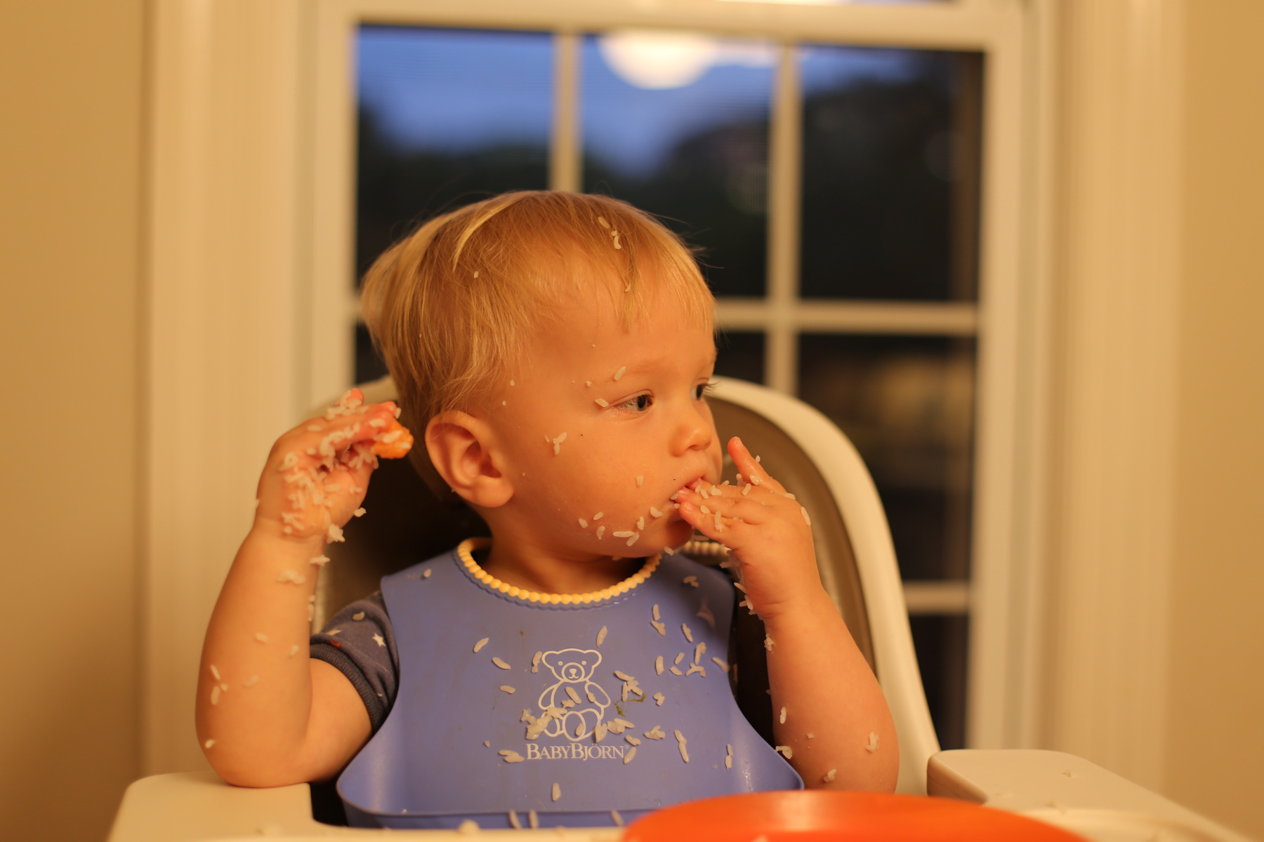 The boys had dinner at home -- mashed hutspot -- and then joined us in their highchairs. They happily chewed on a piece bread and loved the watermelon.