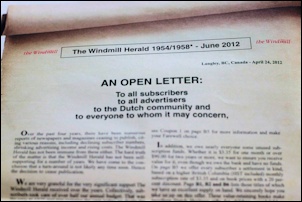 "We were able to slow the effects of a nearly inevitable greying readership with an English-language section in The Windmill Herald," said Albert van der Heide who purchased the paper in 1969, five years after coming to Canada as a teenager. "We keep hearing from grandchildren of 1950s Dutch immigrants interested in their heritage and roots, but not enough to sustain the paper in its current format," he said."