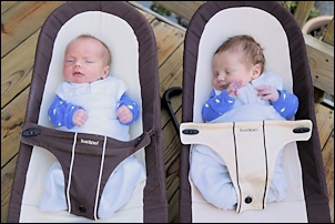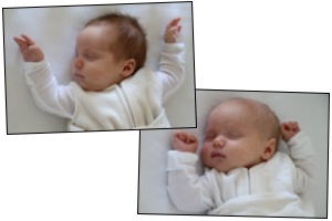This afternoon they fell asleep before we had swaddled them. Here are two pictures.