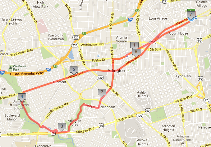 For the first time in a long, long time I ran 7 miles. Last week's race inspired me to perhaps run some more longer distances. In any case, this run felt great. The last part over Wilson is a little boring and long, but it's interesting to run that part in the other direction in any case. The middle part is very interesting, through Lubber Run and 4 Mile Run.