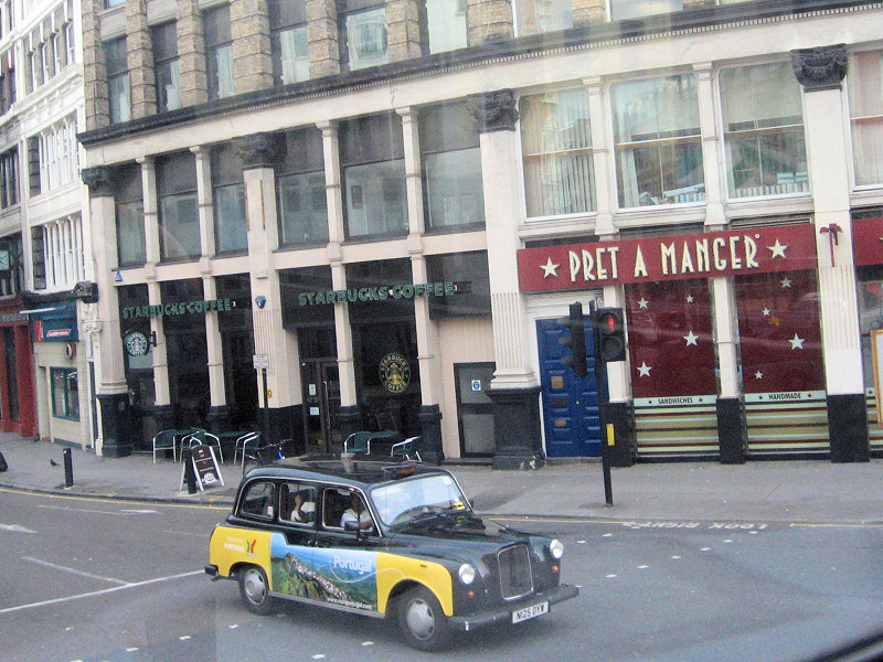 Picture taken from the top of a red double decker bus. There's a Starbucks everywhere in London.