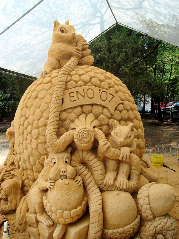A sand sculpture with the Eno's mascot, the squirrel.