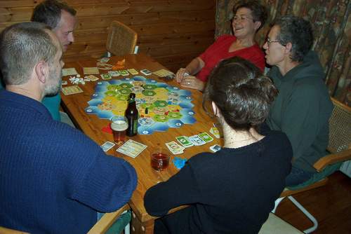 We're at my parents now. Obviously we're playing Kolonisten again. The victims today are my parents' neighbours. We taught hem Kolonisten, and then played two games.
