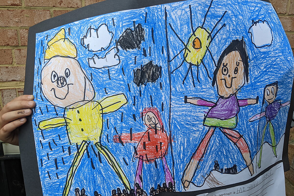 Saturday, June 11, 2022 Adrian drew a picture at school of our family. Half of it in the Netherlands, half in Bulgaria. Can you guess which side is which? Hint, on the left they are wearing rain jackets. Adrian explained: "ik was vergeten mezelf te tekenen". Topic dailylife