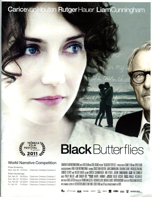 The Tribeca Film Festival is now celebrating its 10th anniversary season. Among the entries this year is Black Butterflies, a German-Dutch-South African production, directed by Oscar nominee Paula van der Oest (Zus en Zo), with an international cast headed by Dutch movie stars Carice van Houten and Rutger Hauer, and Irish actor Liam Cunningham.